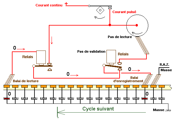 Entraînée par des galets et en commençant par la ligne des 9, la carte passe entre un balai et un rouleau dont l'alimentation en courant pulsé est faite par un rupteur. Celui-ci est synchronisé avec les positions possibles des perforations qui, si elles existent, donnent naissance à des impulsions de lecture.